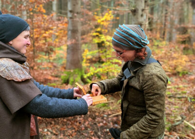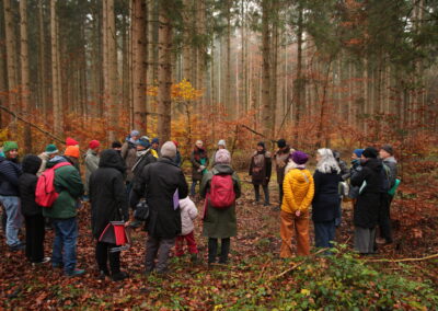 Der Spaziergang dauert ca. 70 Minuten und ist maximal 1,5 km. Wir verlassen die Wege und laufen durch den Wald. Wir achten darauf, dass alle mitkommen können. Für gehbehinderte Personen nur bedingt geeignet.