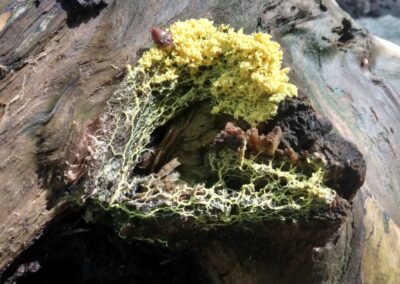 Auf unserem Weg durch das Unterholz wechseln sich poetische Textpassagen mit interaktiven Spielszenen und körperlichen Erfahrungen ab. Die Performer*innen verleiten die Gruppe dazu, ihre multisensorische Achtsamkeit zu trainieren, um im Fungizän überlebensfähig zu werden.